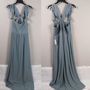 * NWT: June Maxi Dress. The June Maxi Dress is a bridesmaid dress that keeps it flirty while still being elegant. This dress features ruffle detailing along the straps, a smocked elastic back panel for a perfect fit, and an empire waist met with a full skirt.