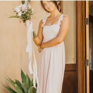 The June Maxi Dress is a bridesmaid dress that keeps it flirty while still being elegant. This dress features ruffle detailing along the straps, a smocked elastic back panel for a perfect fit, and an empire waist met with a full skirt.