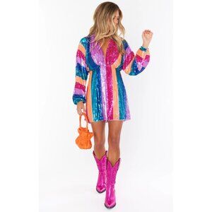 Show Me Your Mumu Kidman Mini Dress Neon Stripe Sequins Good condition, no stains or holes Flaws: Several places where the sequins are loose or missing Size Medium - Zip closure - Pink, orange, green, and blue sequins - Deep v-neck - Long puff sleeves - Lined - Polyester Measurements (measured flat) Pit to pit: 19” Length: 24.5” 2lb Party Going out Glam NYE Vegas