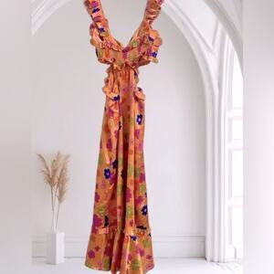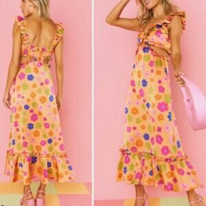 Show Me Your Mumu Lane Midi Dress, Poppin' Poppy Color NWT Beautiful satin midi dress with ruffled straps, flirty side cut outs, and v-neckline. Perfect for a late summer wedding or vacation. Size Medium