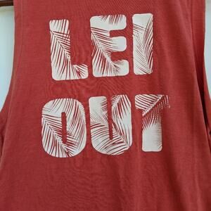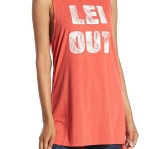 Features: a fun coral/red tank with palm frond white lettering. Muscle tee, unfinished trim, long length. Super soft, good for lounging, or tied up for a beach day. A summer staple in the trendy girl's wardrobe.