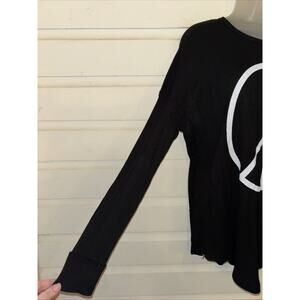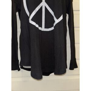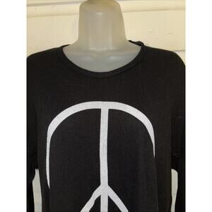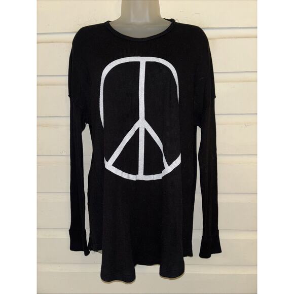 Show Ne Your Mumu Mellow black waffle textured with white screenprint large peace sign long sleeve tunic length pullover top. Features wide rounded neckline and drop shoulder seams. Long straight cut stretch fit sleeves. Cut long and straight through body length, falling to tunic length, low enough to cover most of your bottom hem rounded bottom hem. Medium weight waffle textured fabric. Stretch available. Women’s size medium with a relaxed fit.