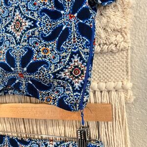 Show Me Your Mumu Miami Retro Outfit Shorts Set Sz Sm. Set has a crop top with zip side and shorts have elastic waist. Colors: Blue, Red, white, Yellow