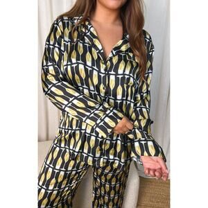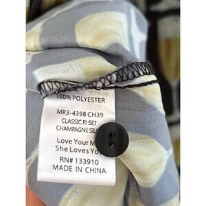 Sleep tight in these super silky button down pajamas! Sold as a set, these playful champagne pjs have a drawstring and elastic waist.