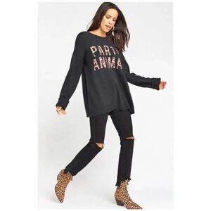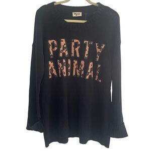 Be the life of the party! This Fireside Party Animal black pullover tunic sweater is by Show Me Your Mumu. The sweater has an animal print “Party Animal” embroidered appliqué on the center front. It’s a women’s size small and fits oversized. Great condition!