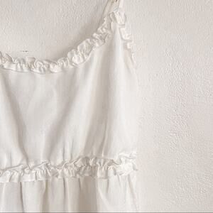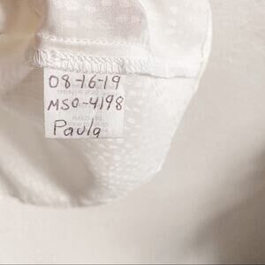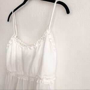 New with tags sample from Show Me Your Mumu in style “Paula”. No fabric label. White with white spots. Lined. Stain and a small pull on the interior (pictured). Adjustable straps, ruffle detail. Elastic below bust.