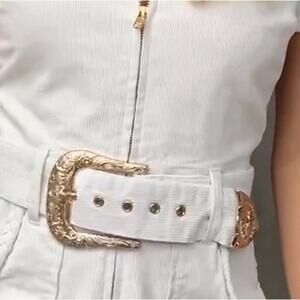 She has a fitted waist, big cargo-ish pockets, and is collared at the top. Get ready to strut your stuff in this fresh cream Outlaw mini dress! Corduroy - 97% Cotton, 3% Spandex Front zip closure Two front and back pockets *Detatchable belt included