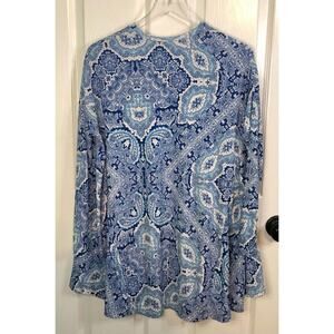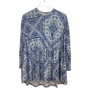 Show Me Your Mumu Tunic - Blue & white paisley design, slight high/low cut, long sleeve, rounded neckline, oversized cut, slinky wrinkle resistant fabric that moves with you. Very good condition, smoke free home.