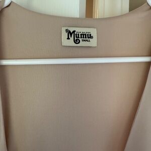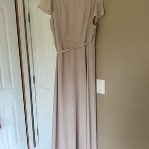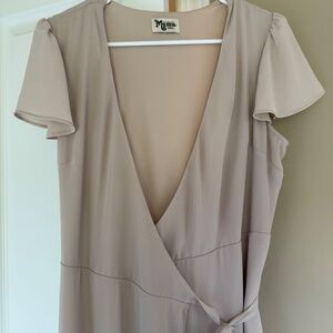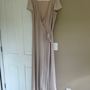 Only worn once for a wedding. Size small. No pulls or stains in the fabric. This is a true wrap dress. The color is a soft champagne color. The product photo I used is a similar style, however the slit in the fabric is the same length the whole way around. The fabric doesn’t have that gradual cut down like this product photo does.