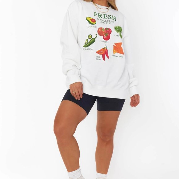 Get all the veggies you need with this oversized Fresh graphic sweatshirt in our classic crew neck cut. An easy throw on outfit for running errands with denim and chunky kicks.