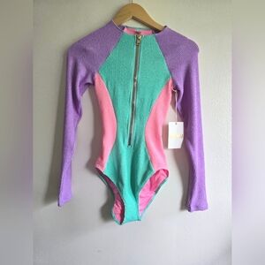 Surf's up in this adorable long sleeve swimsuit. You'll turn heads in our colorblock scrunch and signature Mumu zipper. This suit is perfect for a full day in the water and the sun, you'll never want to take it off!