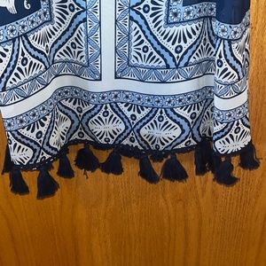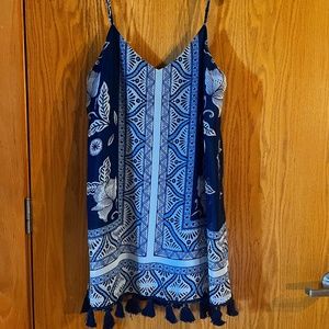 Pool, festival, brunch? You name it this dress has you covered. Mini style with adjustable cami straps and a tassel trimmed bottom. Worn once and in excellent condition! Easy, non wrinkle fabric allows you to throw in a bag to wear later. Made in USA.