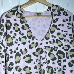 Chic leopard print sweatshirt with V-neck. Soft pink and brown tones. Perfect for casual wear.