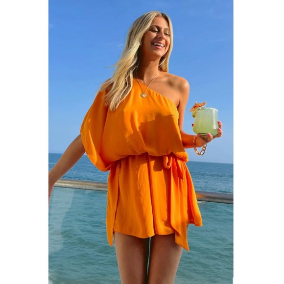 Feel chic yet comfortable in this flirty one shoulder tangerine mini dress! Wear billowing and boho, or cinch your waist with the detachable belt.