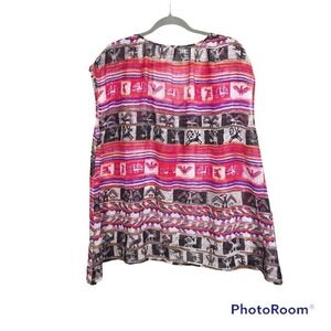 Show Me Your Mumu hieroglyphic tribal print top. Sheer style. Multicolored print. Sleeveless. Asymmetric shark bite style hem.