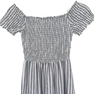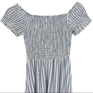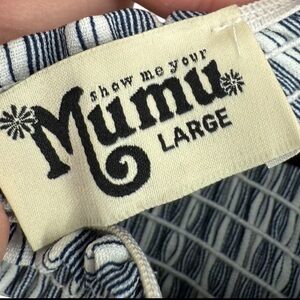 Show Me Your Mumu navy and white striped off the shoulder maxi dress with high-low hem and smocked top. Would be a great wedding guest dress. Size L. Perfect condition, smoke free home.