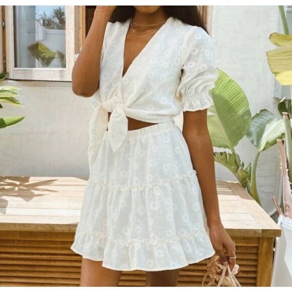 The Devon is a flirty and subtle white floral mini skirt, her lightweight flowy fabric and elastic waist makes her easy to slip on during those warm summer days. Pair with a body suit or her matching Kimmy Tie Top for an easy and breezy summer look.