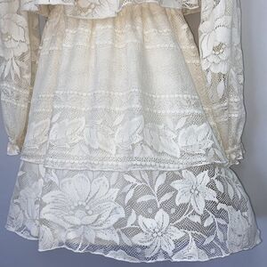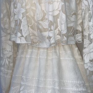 BY SHOW ME YOUR MUMU HERE IS A GORGEOUS 2 TIERED LACE DRESS CALLED”BESS” DONE IN MOONLIGHT ROSES CREAM, WHICH IS OFF WHITE. THIS DARLING DRESS FEATURES AN ELASTCIZED NECKLINE SO IT CAN BE WORN OFF THE SHOULDERS. THE LONG LACE SLEEVES HAVE ELASTIC CUFFS AND THE WAIST IS ELASTIC. THE DRESS IS LINED THROUGHOUT EXCEPT FOR THE LACE SLEEVES. WONDERFUL CONDITION! NEW WITHOUT TAGS! MARKED AN XS, NOTE THE APPROXIMATE MEASUREMENTS