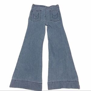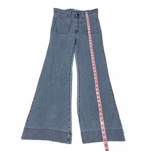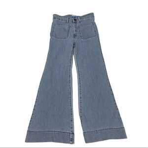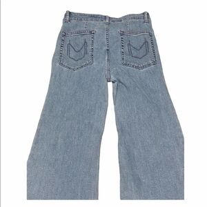 Features: SMYM, wide leg, cropped, flare, button zipper closure, two front pockets, 2 back pockets, light wash, boho, bohemian, jeans, pants, belt loops, cascade wash
