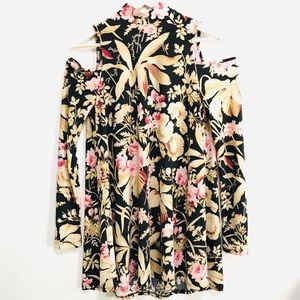Black Background with Gold & Pink Botanical Print. High Neck with Two Buttons and Keyhole Back Closure. Long Sleeves with small Shoulder cuts. Fabric is Stretchy. It can be worn as a Mini Dress or as a Long Top with Jeans.
