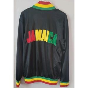 Show Off Collection Mens Sz. L Jamaica Jogger Track Jacket Black Zip Up. Outer Pockets. Nice bright colors no sun or wash fading. Great vintage piece. Good condition. Jamaica in big letters across back and on front side.