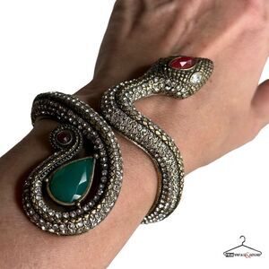 Stunning Snake cuff, it’s large and eye catching. There’s no designer stamp or hallmark, its been part of my private collection for years. Stored away and worn a couple times. It’s paved with crystals over brass tone metal with large accent stones on the head and tail of the snake. Size is adjustable. It’s hinged on spring. Condition is flawless, no missing stones. It opens & closes with ease. Hinge is smooth. Will come to you safely wrapped and bubbled.