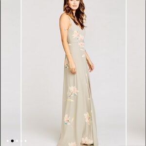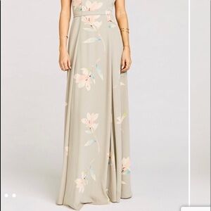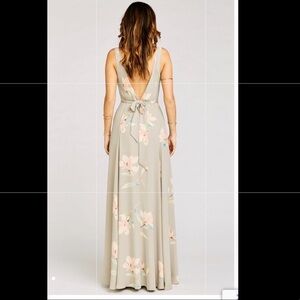 A fitted bodice with a deep neckline is mirrored in the back with a low v, flow out to full, flattering skirt.