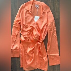 Step into the spotlight with the Clara Collared Mini Dress in Cantaloupe. This captivating dress features a vibrant mustard yellow hue, reminiscent of sun-kissed days. With an a vibrant orange satin that exudes a sense of effortless glamour. Its flattering wrap silhouette accentuates your curves, creating a timeless and sophisticated look.