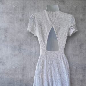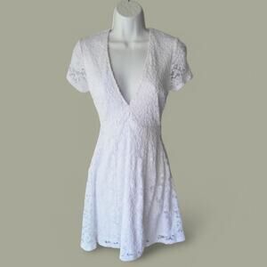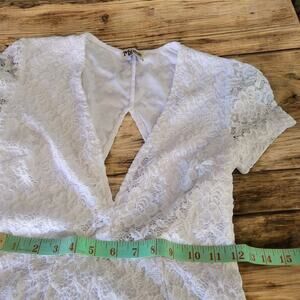 The dress features floral lace fabric accents, a V plunging sexy - neckline, short sleeves, and a zip closure. It is a size medium and made of a lightweight, wrinkle-resistant blend of polyester and nylon. Ideal for various occasions like travel, parties, or casual outings, this short dress is lined and designed to be dry clean only. Made in the United States, this mini dress exudes a feminine and elegant appeal.