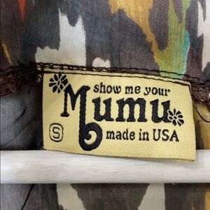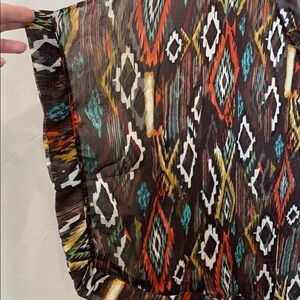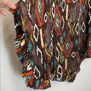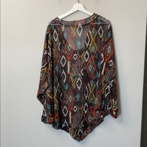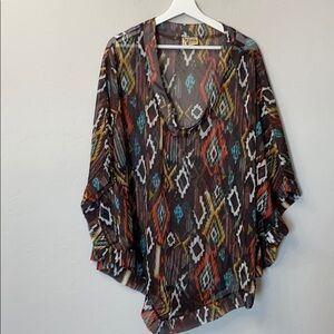 Show me your MUMU brown Aztec tunic size small.100% polyester.Oversized.Length is 29”. Sheer material.