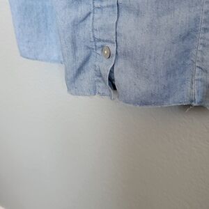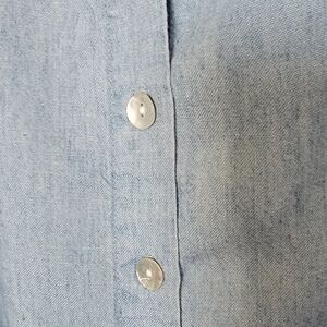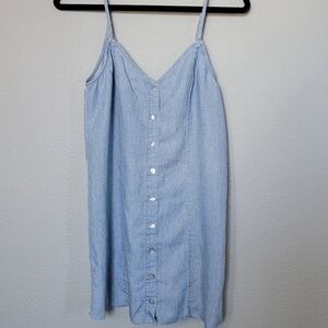 Light chambray linen tencel blend dress. Raw hem. Pretty pearlescent buttons all the way down. Ties in the back. Adjustable straps. Fabric is not stretchy. V neck and back. Summer, spring, casual, girly, flirty, weekend, dinner, date night, shower, sweet, twee, romantic, farmers market, beach