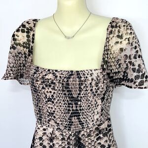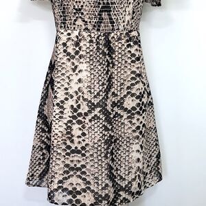 BY SHOW ME YOUR MUMU, HERE IS AN ADORABLE MINI DRESS. IT IS 100% POLY AND FULLY LINED. DONE IN A BEIGE AND COCOA REPTILE PRINT, THIS MUMU FEATURES AN ELASTICIZED BODICE AND BACK FOR STRETCH AND COMFORT WITH RUFFLE CAPPED OFF THE SHOULDER SLEEVES. IT HAS A SQUARE NECK AND AN EMPIRE WAIST. SIDE ZIP. WONDERFUL CONDITION~SIZE MEDIUM, PLEASE NOTE THE MEASUREMENTS