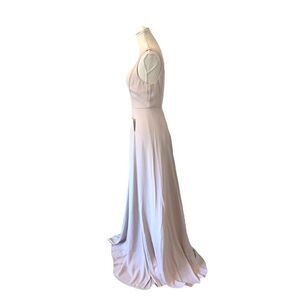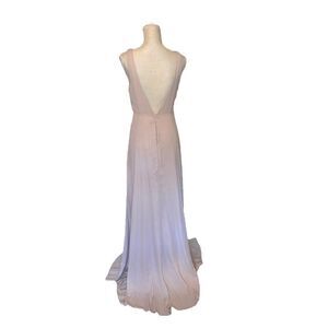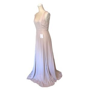 The Jenn Maxi Dress is a stunning, form fitting maxi. A fitted bodice with a deep neckline is mirrored in the back with a low-v, then flows out to a full, flattering skirt. This one is in soft beige chiffon and has a dusty pink hue to it. Removable bridal sash belt within. Made from Chiffon that is 100% Polyester. Lined to the ground. No slits. Zipper closure in back. Dry clean or hand was only.