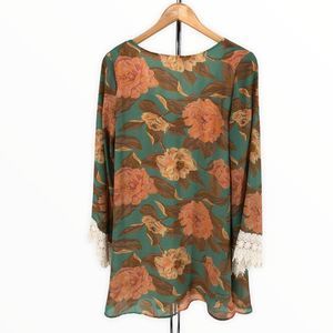 Adorable little dress featuring a turquoise background with peach and brown floral print, long bell sleeves with thick ivory crochet trim at cuffs, fully lined, v neck.