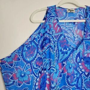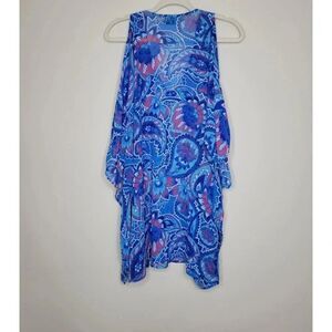 Cold shoulder cut-outs. Blue paisley print. V-neck. Elbow length sleeves. Oversized and Flowy silhouette. Made in the USA.