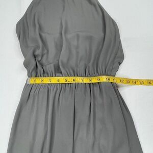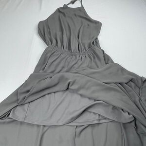 SMYM Heather Halter Dress . Gently preowned in overall good condition. No stains or holes. Hem has been cut/altered at hem. Has A mid rise back, high neckline that ties and a cinched waistline. Lightweight drapey fabric.