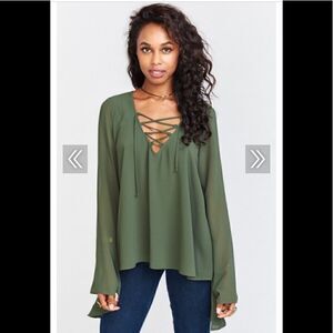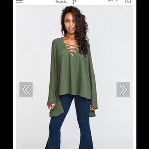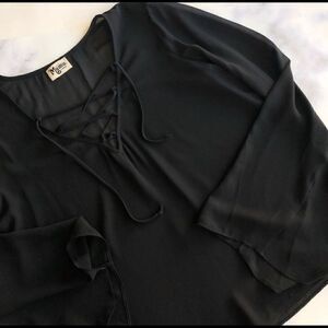 you’ll feel alive in this lil #! when u strut ur stuff, the belled out sleeves follow you like the best backup dancers ever! the cords - they lace right up her front and finish off dangling effortlessly.
