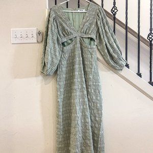 This gown will have you drooling. It's midi-length with a lightly textured fabric. The mint-green is accented with a darker-toned plaid pattern. Worn once to rehearsal dinner, perfect condition.