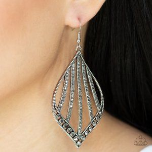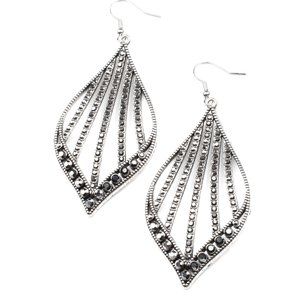 Curved rows of smoky hematite rhinestones streak across the center of a studded marquise shaped silver frame. The bottom of the frame is encrusted in matching hematite rhinestones, creating a dramatic centerpiece. Earring attaches to a standard fishhook fitting.