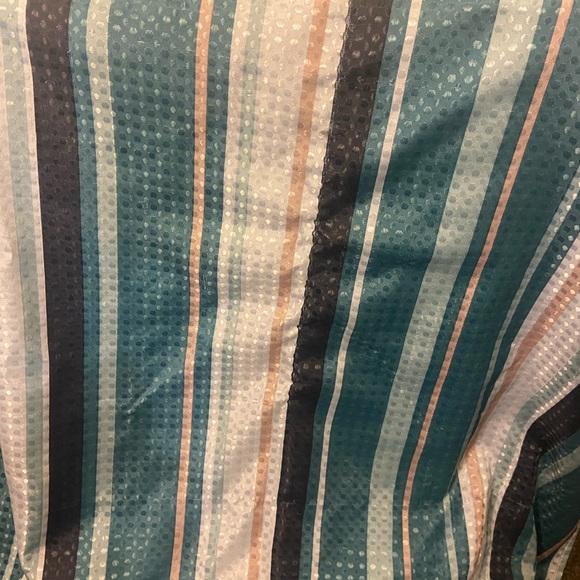 Teal, white, tan and navy shower curtain. Purchased from Kirkland’s.