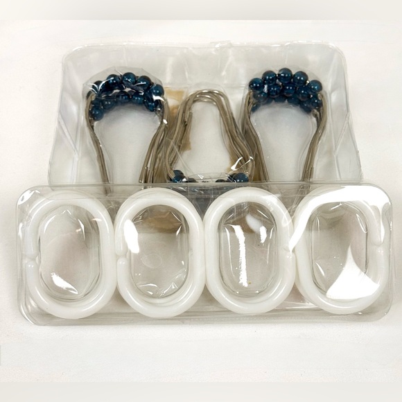 Set of shower curtain rings with white and blue accents. Perfect for bathroom decor.