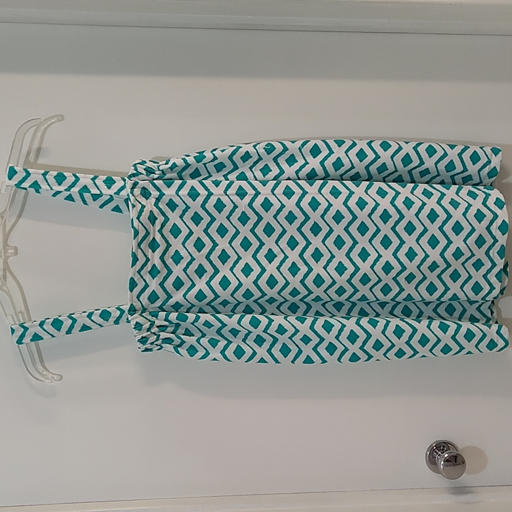 Bobbie Brooks S/M white & teal shower wrap robe. Velcro at top. 24 inches from chest to bottom of robe. Adjustable straps. Polyester knit. Nice for after shower. Good used condition.