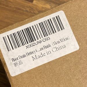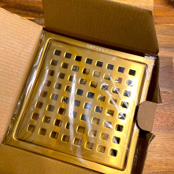 Brass finish floor drain for shower. New in box. Never used. 15cm x 15 cm square.
