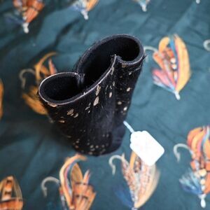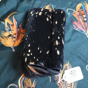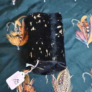 Showman ® Black and Gold Acid Wash Hair on Cowhide Slim Can Cooler. This stylish slim can holder features black hair on cowhide with gold acid wash accents. This high-quality holder will keep your drink chilled and your hands cozy. Can be folded flat for easy transport or storage and *fits most 12oz slim cans* when open.