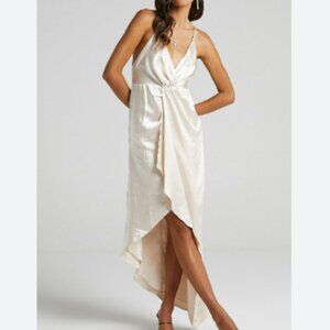Showpo Jayne Twist Front Maxi Dress in Champagne Satin Beige Color