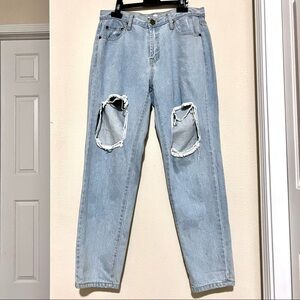 Trendy boyfriend jeans with ripped knees. Light blue denim. Rolled cuffs for a casual look.