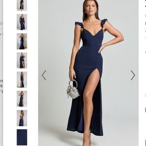 Showpo MORE THAN THIS DRESS - RUFFLE STRAP THIGH SPLIT DRESS IN NAVY Size 10