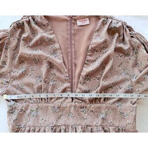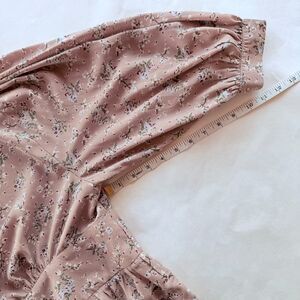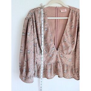 Floral print blouse in a taupe pink featuring a plunge v-neck, waist emphasizing band, peplum style bottom, and 3/4 length sleeves. Hidden zipper at the back. Cropped length.