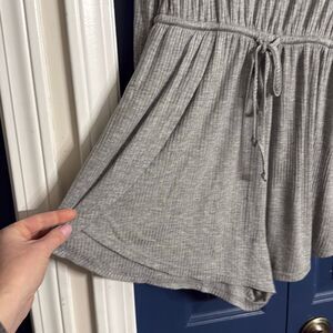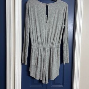 Ribbed long sleeve romper, key hole back, elastic waist with drawstring.