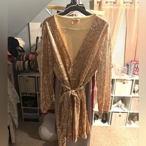 Shimmering sequin wrap dress with a deep V-neck. Perfect for parties and special occasions.